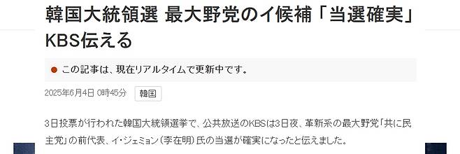 | ▲ 이재명 더불어민주당 대선 후보의 당선을 전하는 NHK 기사 |