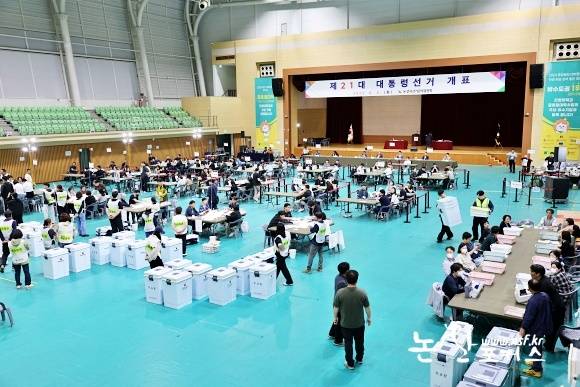 | ▲ 논산시 대선투표 개표소인 건양대 짐나지움 개표현장(2026. 6. 3) |