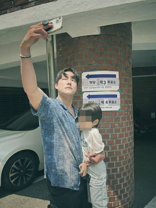 공개된 사진 속 아들을 품에 안은 채 투표소 앞에서 인증샷을 남기고 있다. 파란색 반팔 셔츠 차림의 조태관은 진지한 표정으로 카메라를 응시하고 있다.
