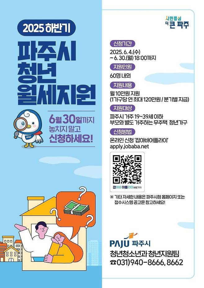 파주시(시장 김경일)가 6월 4일부터 30일까지 청년들의 주거비 부담 완화를 위해 시행하는 '청년 월세 지원사업' 하반기 참여자를 모집한다.