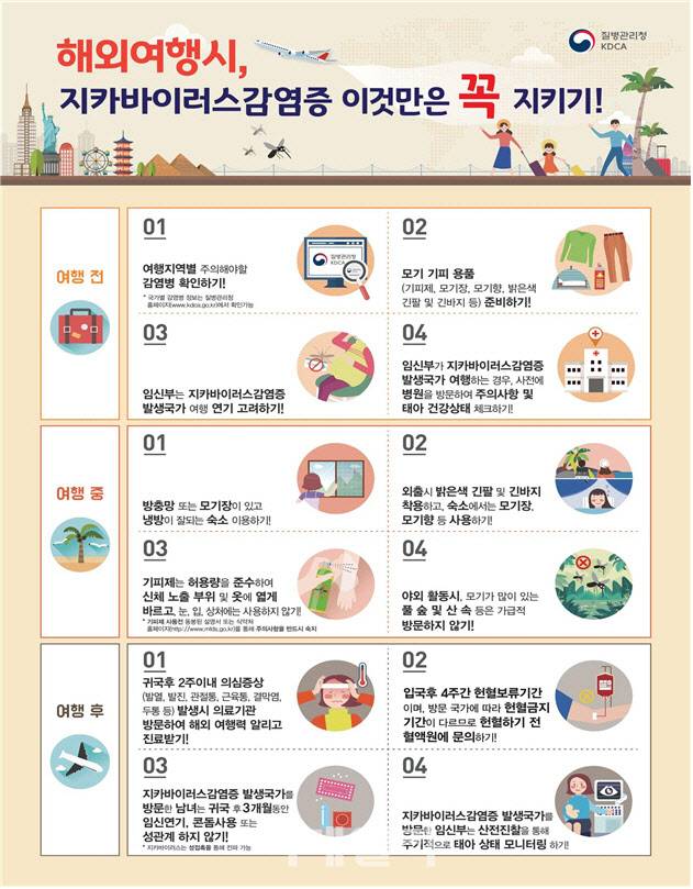 질병청은 지카바이러스 감염증 발생국가 여행 후 3개월간 임신 연기 및 콘돔 사용 등 성 접촉을 피하고, 예방수칙을 숙지해야 한다고 강조했다. 태아의 선천성 기형을 초래할 수 있어서다. 이를 위해 해외 출국 전에는 △해당 지역별 주의해야 할 감염병 정보 확인하기(질병청 누리집 국가별감염병예방정보) △모기 예방법을 숙지하고 모기기피 용품 및 상비약 준비하기 등을 점검해야 한다.