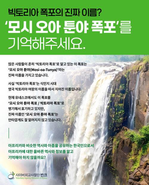 사이버 외교사절단 반크(단장 박기태)가 세계 3대 폭포로 알려진 아프리카의 '빅토리아 폭포' 용어 대신 현지어 '모시 오아 툰야'를 사용하자는 캠페인에 나섰습니다.