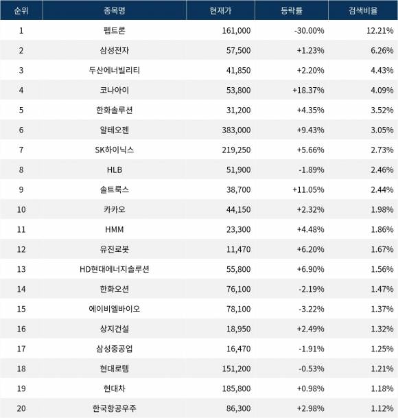 이어 삼성전자(005930)가 검색비율 2위를 기록하며 1.23%의 상승세를 보이고 있다.