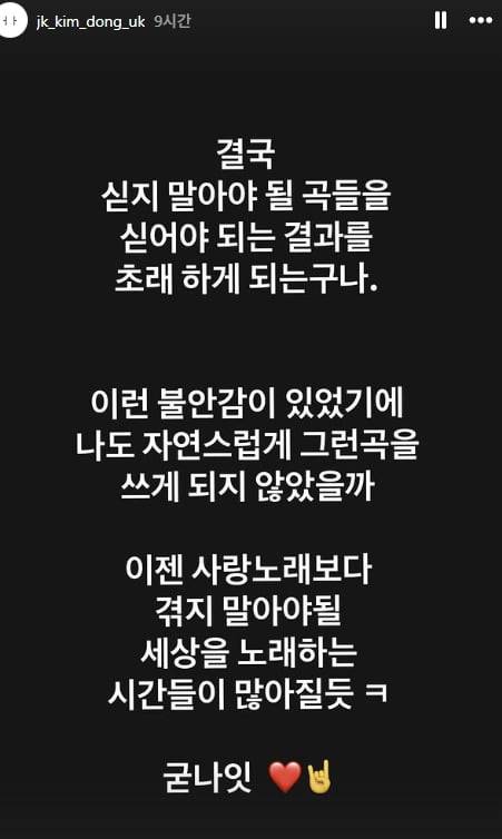 그는 "이런 불안감이 있었기에 나도 자연스럽게 그런 곡을 쓰게 되지 않았을까"라며 "이젠 사랑 노래보다 겪지 말아야 될 세상을 노래하는 시간들이 많이 질 듯"이라고 말하며 심경을 드러냈다.