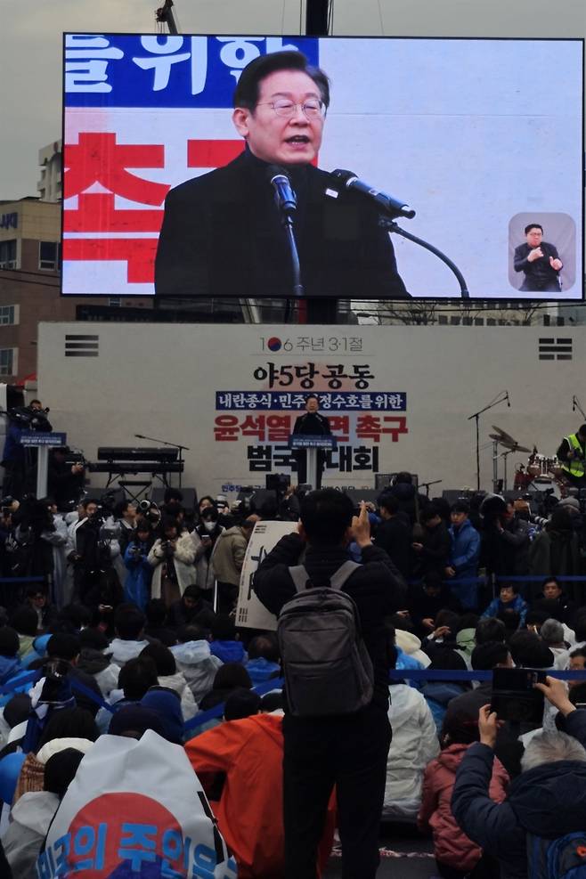 | ▲ 지난 3월 1일 오후 서울 종로구 안국역 삼거리에서 야 5당 공동으로 열린 '내란종식·민주헌정수호를 위한 윤석열 파면 촉구 범국민대회'에서 이재명 민주당 후보가 연설을 하고 있다. |