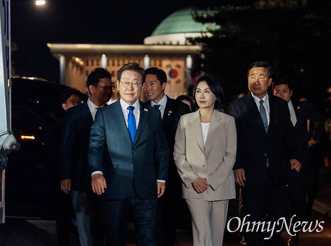 | ▲ 제21대 대통령 당선이 유력한 더불어민주당 이재명 대선 후보가 부인 김혜경 여사와 함께 4일 오전 서울 여의도 국회 앞에 마련된 무대로 이동하고 있다. |