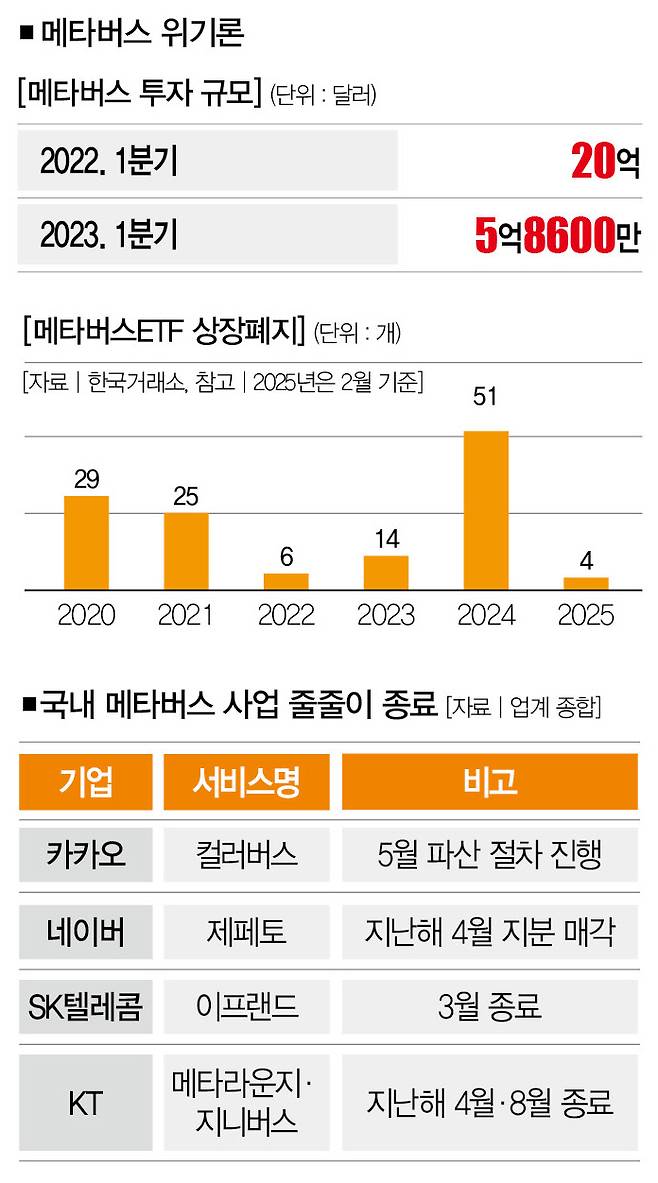 고작 2년 전만 해도 IT산업의 차세대 먹거리로 스포트라이트를 받았던 메타버스의 현주소다. 국내 메타버스 사업자들이 줄줄이 서비스를 중단하면서 메타버스 시장엔 찬바람이 불고 있다.