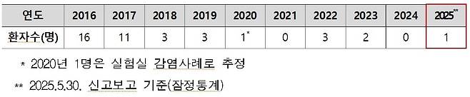 | ▲ 지카바이러스 감염증 국내 발생 현황. 우리나라 지카바이러스 감염증 환자는 2016년 이후 현재까지 총 40명 환자가 신고되고 있다. |