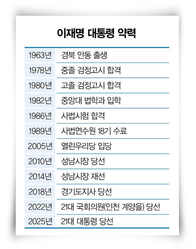밑바닥에서 출발한 소년공 이재명은 6월 4일 49.29% 득표율로 국민의힘 김문수 후보(41.15%)를 따돌리고 6·3대선에서 승리했다. 1728만7513표를 받아 대한민국 건국 이래 역대 최다 득표수를 기록했다. 대한민국 권력 정점에 오르기까지 이재명 대통령의 삶은 숱한 고난과 역경으로 가득했다. 흙수저로 태어나 사법시험 합격, 세 번의 도전 끝에 대권을 거머쥔 이 대통령의 삶은 그가 밝힌 대로 겁 없는 여정 그 자체였다.