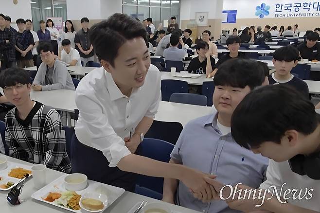 | ▲ 이준석 개혁신당 후보가 21대 대선을 하루 앞둔 2일 오전 경기 시흥시 한국공학대학교를 찾아 '학식먹자 이준석' 행사를 진행하고 있다. |