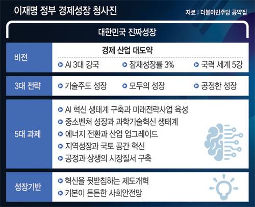 경제·산업 대도약으로 인공지능(AI) 3대 강국·잠재성장률 3%·국력 세계 5강 달성을 하겠다는 게 '이재명표' 경제성장전략이다.