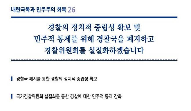 "경찰의 정치적 중립성 확보 및 민주적 통제를 위해 경찰국을 폐지하고 경찰위원회를 실질화하겠습니다."