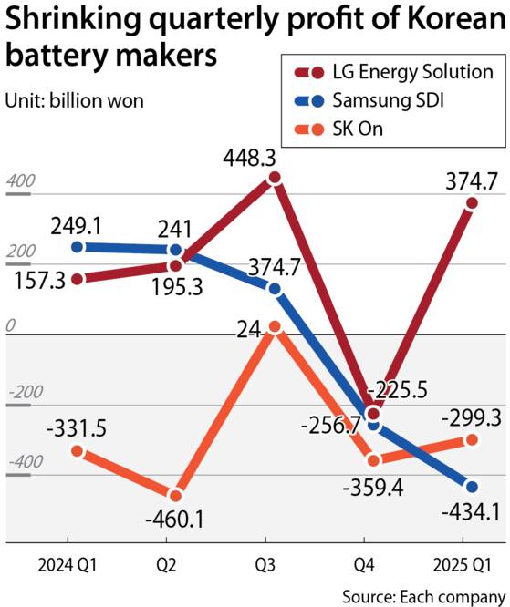 Samsung SDI reported an operating loss of 434.1 billion won during the same period while SK On logged 299.3 billion won of losses.