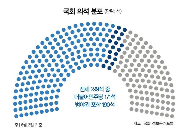 이재명 정부는 직선제 개헌 이후 가장 많은 의석수(출범 시점 기준)를 가진 여당과 함께 국정을 이끌어가게 됐다(인포그래픽 참조). 더불어민주당은 국회 299석 중 171석으로 단독 과반이다. 여기에 조국혁신당(12석) 등 범여권을 합치면 190석이 돼 개헌을 단독으로 추진할 수 있는 200석에 근접한다. 이재명 정부의 이 같은 안정적 국정운영 구도는 다음 총선을 치르는 2028년 4월까지 약 3년간 지속될 수 있다.