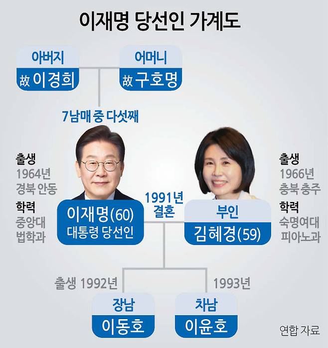 이 대통령은 가족에 대한 애틋함을 공개적으로 드러냈다. 이 대통령은 선거 하루 전인 지난 2일 유튜브 ‘김어준의 겸손은 힘들다 뉴스공장’ 인터뷰에서 “정말 고통스럽다. 아내와 가족에게 너무 미안하다”고 말했다. 그는 “저 자신이 당하는 것은 감수하면 되지만 죄 없는 자식들, 특히 아내는 저 때문에 (정치에) 이끌려 들어왔는데 그렇게 모욕을 주고 고통을 당했다”고 했다.