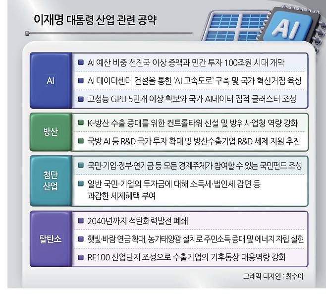 반도체 산업에서도 전방위 지원이 예상된다. 앞서 이 대통령은 주력인 메모리와 미래 동력으로 꼽히는 AI 반도체를 비롯해 하위 생태계를 아우르는 지원안을 제시했다.