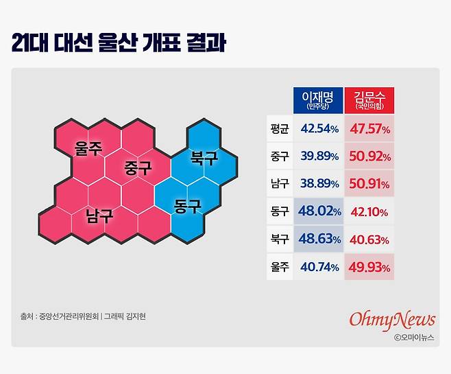 이번 대선에서 울산은 몇 가지 점에서 주목 받았다. 유례 없는 야권 연대로 치러진 만큼 노동자의 도시 북구와 동구에서의 결과와, 김기현 국민의힘 의원과 탈당 후 민주당에 입당한 김상욱 의원이 있는 남구의 결과였다.