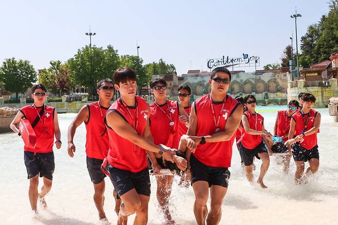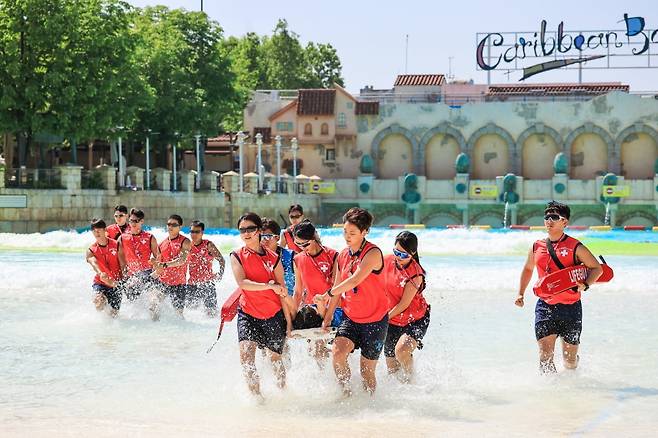 에버랜드의 워터파크 캐리비안 베이가 본격 여름 휴가철을 앞두고 몰놀이 안전을 책임지는 라이프가드들의 에너지 넘치는 훈련 현장을 4일 공개했다. 이날 훈련에는 전문 라이프가드들의 수상 인명구조, 심폐소생술(CPR) 등 다양한 모의훈련과 교육이 진행됐다.