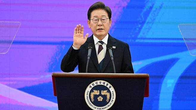 ▲ 이재명 대통령이 4일 서울 여의도 국회에서 열린 제21대 대통령 취임선서식에서 취임 선서를 하고 있다.