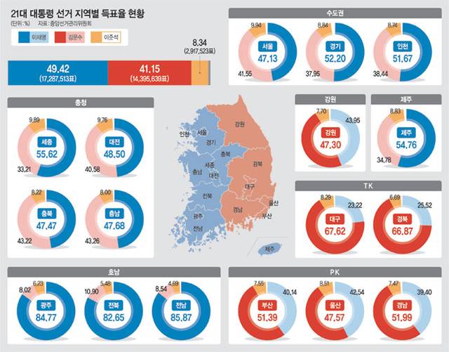 충북의 ‘족집게 표심’은 이번에도 입증됐다. 앞선 8차례 대선의 승자를 맞힌 데 이어 충북은 이 대통령(50만1990표·47.47%)에게 힘을 실어줬다. 김 후보는 45만7065표(43.22%)를 받았다. 충남에서 이 대통령은 47.68%(66만1316표) 득표율로 43.26%(60만108표)의 김 후보를 앞질렀다. 이 대통령은 대전에서도 48.50%(47만321표)로 40.58%(39만3549표)의 김 후보를 이겼다. 민주당 지지세가 강한 광주(84.77%), 전남(85.87%), 전북(82.65%) 등 호남에서 이 대통령은 압도적 지지를 받았다.