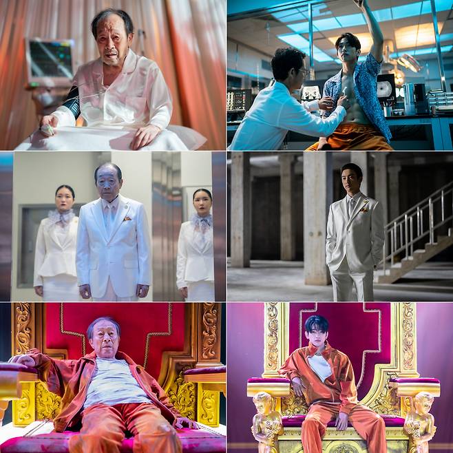이번에 공개된 스틸은 췌장이식을 받은 후 젊음을 흡수하는 초능력으로 인해 급격하게 회춘한 영춘 역 신구와 박진영의 닮은꼴 모습이 눈길을 끈다. 먼저 같은 의상을 입고 함께 찍은 투샷에서는 서늘한 표정까지 똑닮은 두 사람의 높은 싱크로율이 놀라움을 자아낸다. 이어 비슷한 상황 속 미묘하게 다른 분위기를 풍기는 두 영춘, 노쇠하고 지친 노년의 영춘의 모습을 리얼하게 보여준 신구와 자신감 넘치고 당당한 영춘의 젊음을 생생하게 표현한 박진영을 통해 영생을 갈망하는 한 인물의 다층적인 면모가 엿보인다.