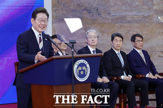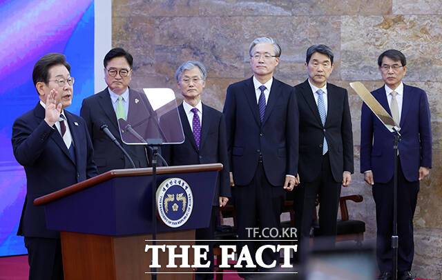 [더팩트ㅣ국회사진기자단] 이재명 대통령이 4일 오전 11시 서울 여의도 국회 로텐더홀에서 '취임선서'를 하고 있다.
