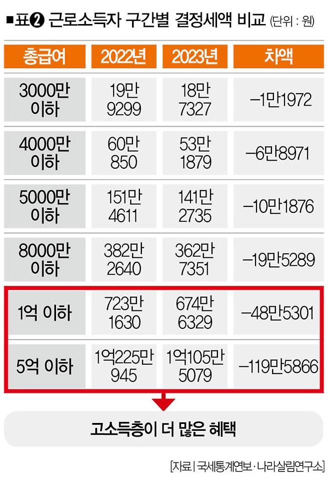 물론 연봉 1억원 이하 근로소득자의 결정세액이 줄어든 덴 2022년 당시 여야 합의에 따른 소득세 과표구간 상향조정이 영향을 미쳤다. 예컨대 소득세 6% 적용구간은 1200만원 이하에서 1400만원 이하로, 15% 적용구간은 4600만원 이하에서 5000만원 이하로 조정됐다. 과표구간이 상향조정된 구간은 세율이 낮아지므로 당연히 감세 효과가 발생한다. 식대, 주거비, 교통비, 교육비, 생계비, 결혼, 출산, 양육 등에서 세액공제도 늘었다.