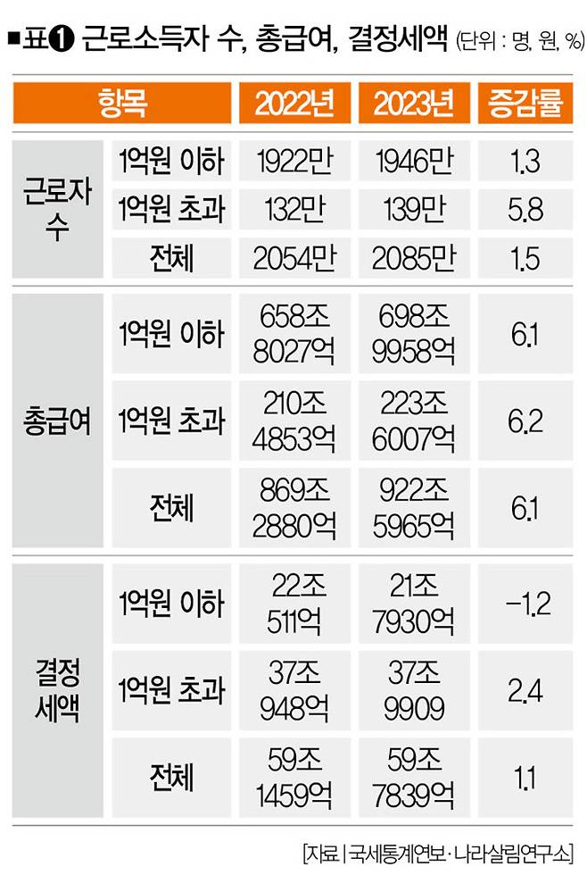 우선 근로소득자 증감부터 보자. 근로소득자는 2022년 2054만명에서 2023년 2085만명으로 31만명(1.5%) 늘었다. 연봉을 기준으로 근로소득자 증감률을 따져 보면 연봉 1억원 이하 근로소득자 증가율은 1.3%(1922만명→1946만명), 1억원 초과는 5.8%(132만명→139만명)였다. 고소득 근로자가 더 많이 늘었다는 얘기다(표➊ 참조).