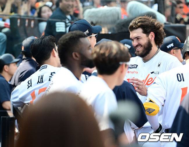 [OSEN=김성락 기자] 6이닝 무실점 호투를 마치고 더그아웃으로 돌아온 한화 폰세는 곧바로 동료들의 품에 안겼다.