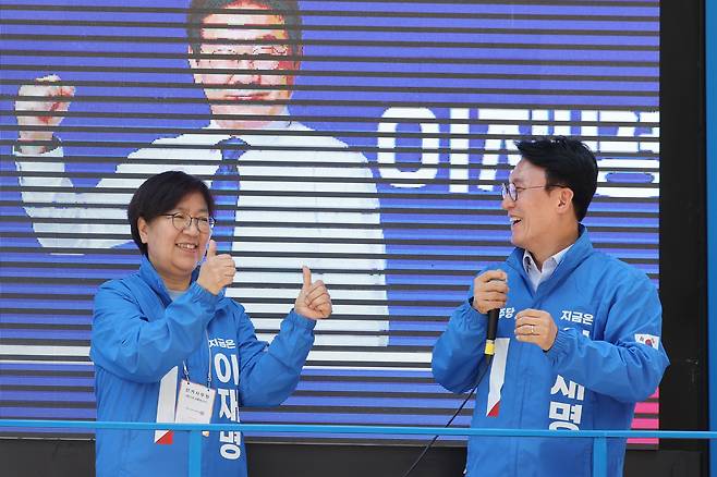 | ▲ 더불어민주당 정은경 총괄선거대책위원장(왼쪽)과 김민석 상임공동선대위원장이 14일 서울 영등포구 여의도역 인근에서 이재명 대선 후보 지원 유세를 펼치고 있다 |