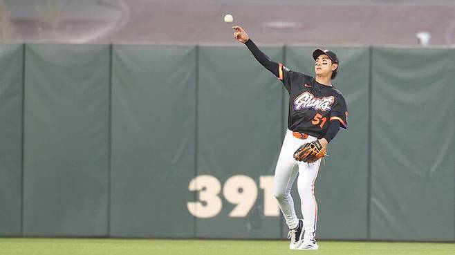 ▲ 샌디에이고 전에서 뜬공을 처리하는 샌프란시스코 중견수 이정후