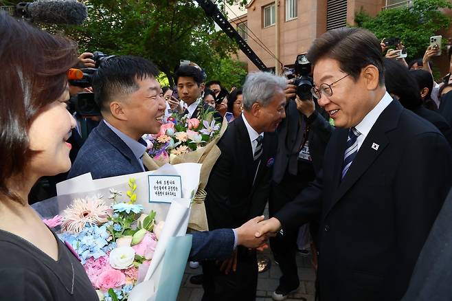 이재명 대통령이 4일 오전 인천 계양구 자택앞에서 주민들과 인사하고 있다.