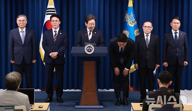 [서울=뉴시스] 고범준 기자 = 이재명 대통령이 4일 서울 용산 대통령실 청사에서 새 정부 첫 인사 발표를 하고 있다. 왼쪽부터 이종석 국정원장 후보자, 김민석 국무총리 후보자, 이 대통령, 강훈식 비서실장, 위성락 안보실장, 황인권 경호처장. (대통령실통신사진기자단) 2025.06.04. bjko@newsis.com