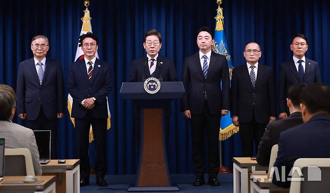 [서울=뉴시스] 고범준 기자 = 이재명 대통령이 4일 서울 용산 대통령실 청사에서 새 정부 첫 인사 발표를 하고 있다. 왼쪽부터 이종석 국정원장 후보자, 김민석 국무총리 후보자, 이 대통령, 강훈식 비서실장, 위성락 안보실장, 황인권 경호처장. (대통령실통신사진기자단) 2025.06.04. bjko@newsis.com