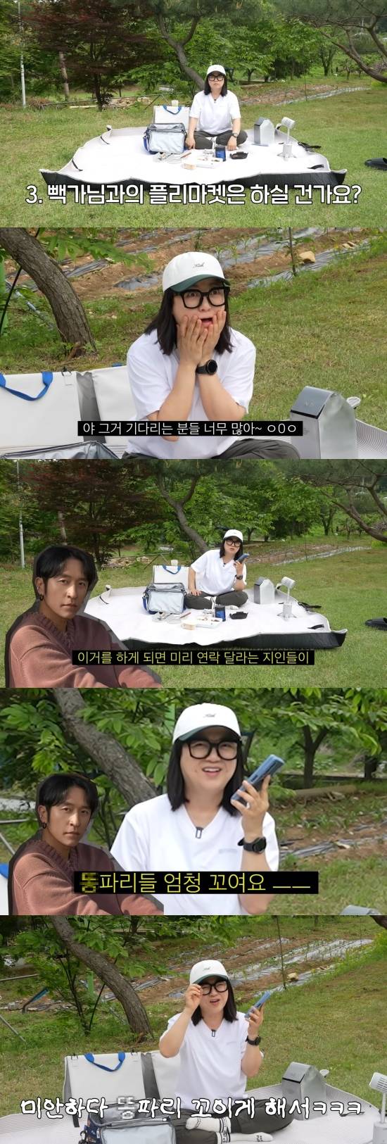 이를 듣고 웃음을 터뜨린 김숙은 "그거 기다리는 분들 너무 많다"며 빽가에게 전화했다. 김숙과 마찬가지로 캠핑에 진심인 빽가는 앞서 집에 가득한 캠핑 용품을 공개하며 플리마켓을 예고했던 바 있다.