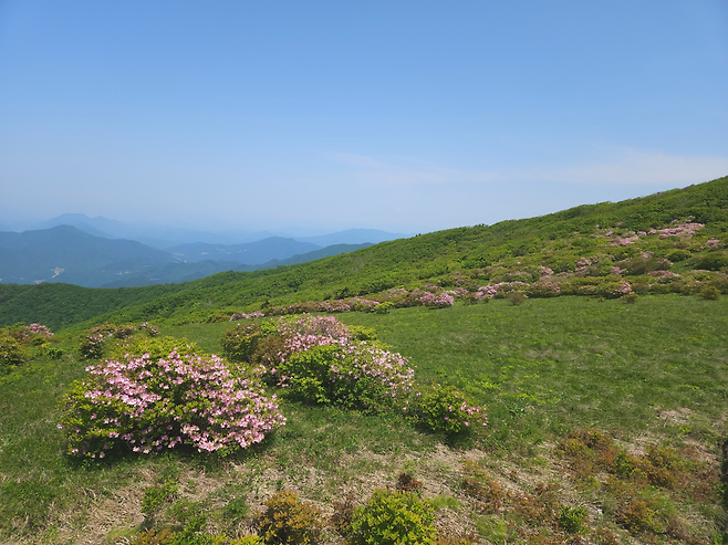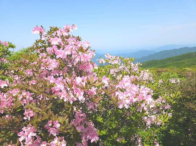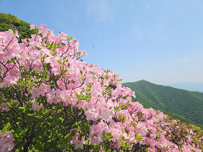 특히 맑은 날에는 철쭉과 함께 펼쳐지는 장엄한 산세와 푸른 하늘이 어우러져 더욱 환상적인 풍경을 선사한다. [사진=소백산 국립공원 제공]