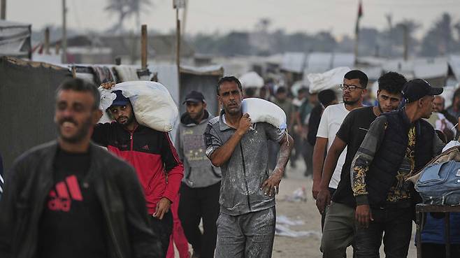 ▲ 3일 팔레스타인 사람들이 가자 인도주의 재단이 제공한 식량과 가방을 가자 지구 남부 칸 유니스에서 들고 있다.