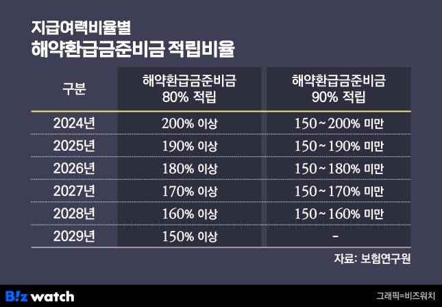 금융당국은 킥스 비율의 일정 조건을 충족하는 보험사에 한해서는 배당가능이익을 확보할 수 있도록 해약환급금준비금 적립비율을 조정토록 했다. 올해는 킥스 비율이 190% 이상인 경우 해약환급금준비금을 80%만 적립하면 된다. 이 기준은 매년 10%포인트 낮아져 2029년에는 킥스 비율 150% 이상으로 기준이 하향된다.