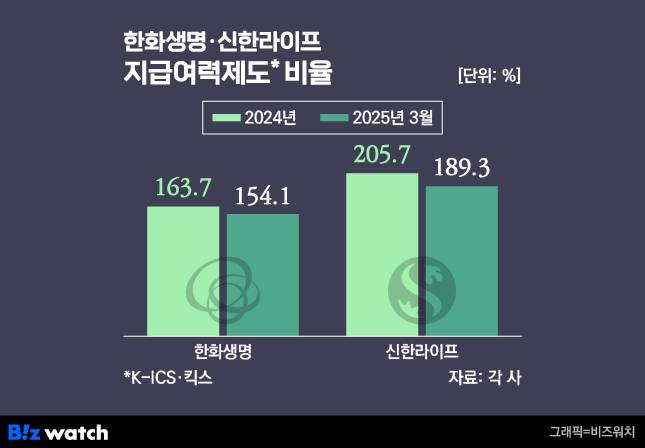 올해 1분기 기준 한화생명의 킥스 비율은 154.1%로 전년 말(163.7%)보다 9.6%포인트 떨어졌다. 신한라이프 역시 1분기 킥스 비율이 189.3%를 기록해 전년 말(205.7%) 대비 16.4%포인트 악화했다.