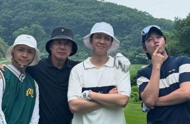 공개된 사진에는 이승기, 손지창, 배우 장근석, 그리고 밴드 'FT아일랜드' 멤버 이홍기가 골프장에서 나란히 서 있는 모습이 담겼다. 흰색 버킷햇을 쓴 이승기는 환한 미소로 시선을 사로잡았고 손지창은 이승기와 이홍기의 어깨를 감싸며 친분을 드러냈다. 장근석은 장난기 가득한 포즈로 카메라를 응시하며 화기애애한 분위기를 자아냈다.