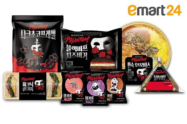 이마트24는 뮤지컬 '팬텀'과 협업한 상품 8종을 선보였다고 밝혔다. '팬텀'은 프랑스 소설 '오페라의 유령'을 원작으로 만든 뮤지컬이다. 올해 한국 공연 10주년을 맞이해 뮤지컬 팬들 사이에서 더 큰 관심을 모으고 있다. '팬텀'과 협업해 선보이는 상품은 △피크닉 샌드위치(3900원) △블랙비프 치즈버거(4900원) △나폴리탄 치즈돈가스 삼각김밥(1400원) △반숙 오므라이스 정식(5500원) △다크초코프레첼(2000원) △마카롱 3종(2300원) 등이다.