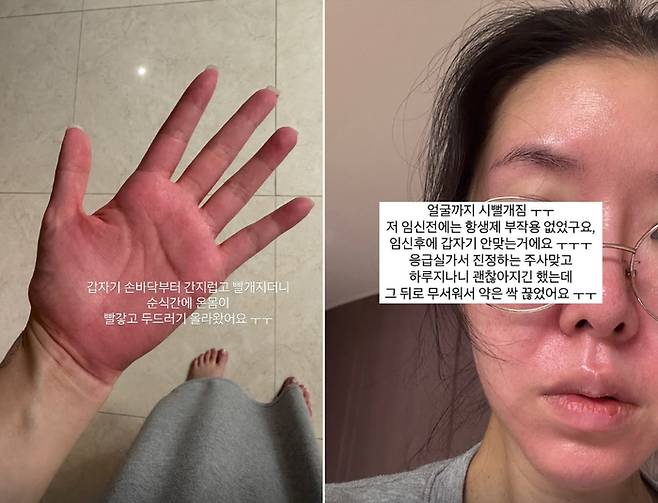 공개된 사진에는 새빨갛게 부어오른 손바닥과 얼굴, 그리고 링거를 맞는 모습이 담겨 있다.