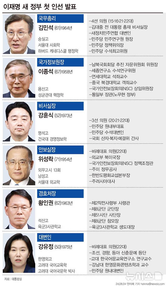 [서울=뉴시스] 이재명 대통령은 4일 김민석 국무총리 후보자를 비롯한 새 정부 첫 인사를 직접 발표했다. 국무총리에 김민석 더불어민주당 국회의원, 국가정보원장에 이종석 전 통일부 장관을 각각 지명했다. 대통령 비서실장에는 강훈식 국회의원, 안보실장에는 위성락 국회의원을 임명했고, 경호처장에는 황인권 전 육군대장을 지명했다. 대변인엔 강유정 국회의원이 임명됐다.