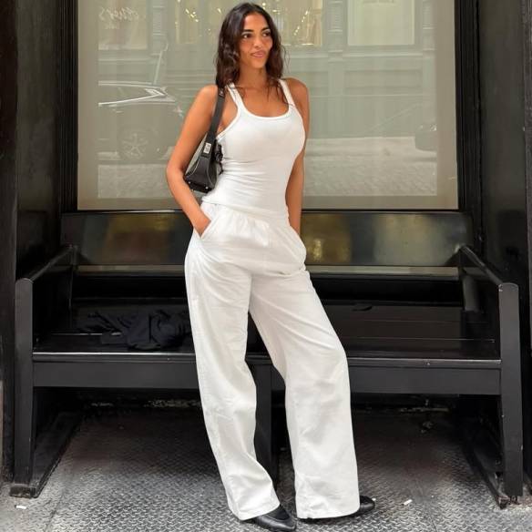 산드라 슈햅은 가장 베이직한 아이템인 깔끔한 슬리브리스 톱 과 루스한 핏의 팬츠로 힘 뺀 듯 자연스러운 화이트 룩을 완성했습니다. 군더더기 하나 없이 미니멀한 조합이지만, 실루엣의 여유로움이 멋스러움을 더해주죠.