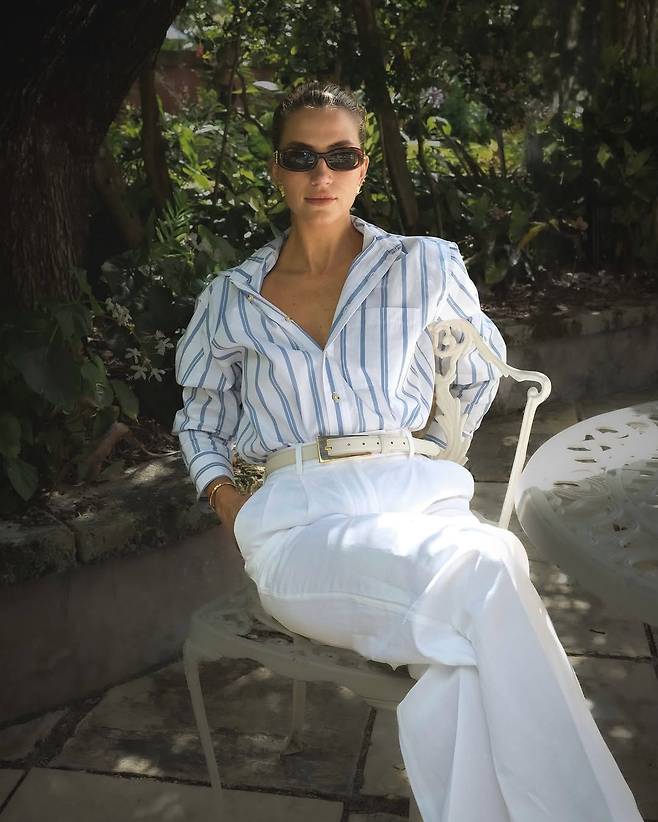 화이트 컬러와 최고의 궁합을 자랑하는 청량한 블루 스트라이프 패턴은 상의에도 적용 가능합니다. 카스 디미코는 클래식한 블루 스트라이프 셔츠를 자연스럽게 풀어 입고 여기에 화이트 팬츠까지 매치했죠. 볼드한 벨트와 슬림한 선글라스로 여유로운 바캉스 룩 감성을 연출했네요.