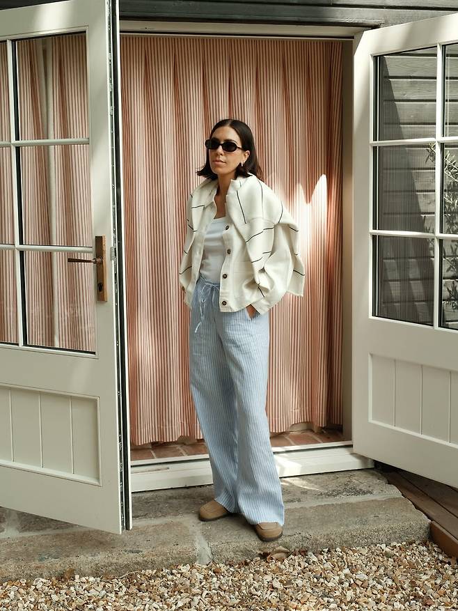 제시카 스카이는 화이트 가디건 으로 상의를 가볍게 감싸고, 이너로는 튜브톱을 매치해 시원한 무드를 더했습니다. 하늘하늘한 파자마 풍 스트라이프 팬츠로 룩에 여유를 부여하고, 뉴트럴한 컬러의 슈즈로 전체적인 톤을 부드럽게 이어갔죠. 여유로움과 고급스러운 무드를 모두 잡은 정석과도 같은 조합이죠?