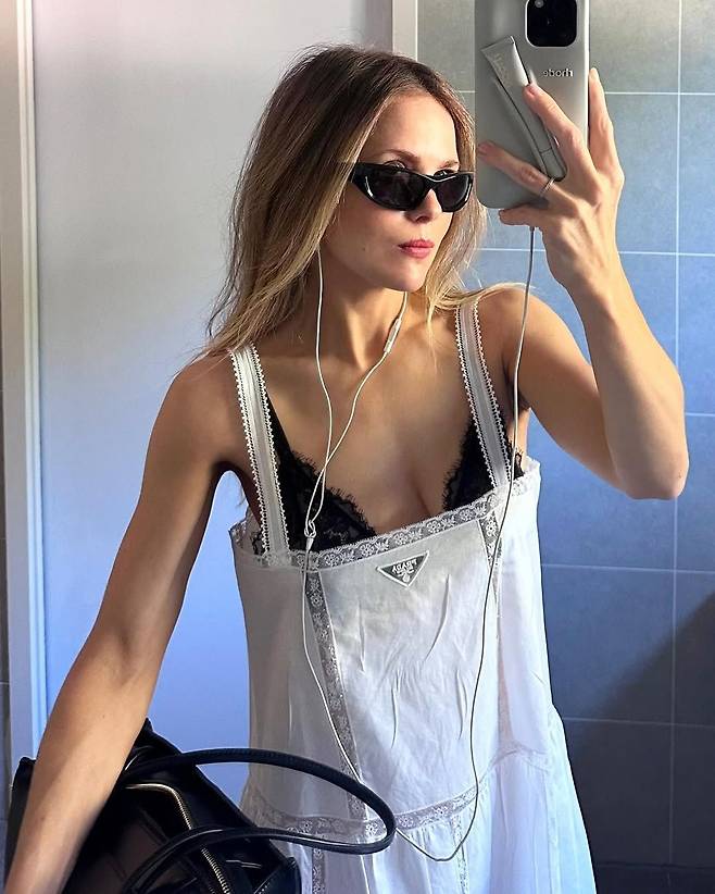 화이트를 조연처럼 활용하는 방법도 있죠. 레이첼 롤링스는 빈티지한 무드의 슬립 드레스 사이로 블랙 레이스 브라를 과감하게 드러냈습니다. 화이트가 선사하는 순수한 무드 위에 시크한 블랙 포인트를 더했죠. 유선 이어폰마저 무심한 액세서리가 되어주는 듯하죠?