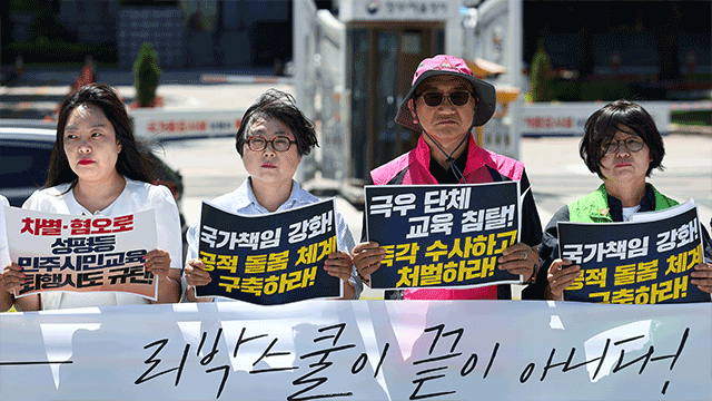 전국교직원노동조합, 참교육을위한전국학부모회 등 6개 단체는 오늘(4일) 오후 정부서울청사 앞에서 기자회견을 열고 “새 정부는 리박스쿨을 비롯한 극우 세력과 교육 당국의 유착 관계를 철저히 진상조사하고 관계자 처벌에 나서라”고 촉구했습니다.