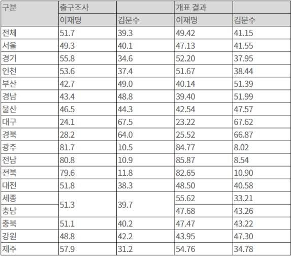 출구조사와 개표 결과 1, 2위가 뒤집힌 곳은 울산과 강원이다. 두 곳 모두 이 후보가 1위로 예측됐지만 개표 결과 김 후보가 1위를 차지했다. 출구조사 결과 이 대통령이 10%포인트 이상 앞서는 것으로 전망됐던 대전, 충남·세종, 충북은 격차가 4∼8%포인트 안팎으로 크게 줄었다. 부산과 경남도 출구조사에선 김 후보가 5∼7%포인트로 앞섰지만, 개표에선 10%포인트 이상으로 격차가 확대됐다. 출구조사가 빗나간 곳은 주로 보수 성향이 강한 곳이다. 즉 방송 3사 출구조사는 '샤이보수'를 놓친 것이다.