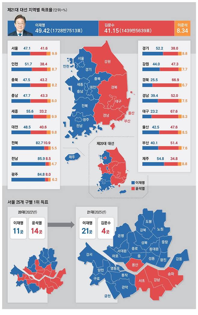 그러나 이번 대선에서는 이 대통령이 김 후보를 상대하며 용산구를 제외한 6대1로 구도를 역전시켰다. 그 외에 윤 전 대통령을 뽑았던 종로구·중구·동대문구·양천구 등도 이번엔 이 대통령 우세 지역으로 전환했다. 이준석 개혁신당 대선후보는 1위를 기록한 지역은 없었지만, 전국 중 서울에서 가장 높은 9.9% 득표율을 기록하며 희망의 불씨를 살렸다.